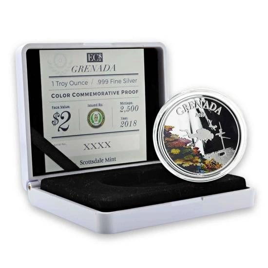 La pièce Grenade : Diving Paradise colorée 1 once d'argent 2018 Proof est un produit unique qui représente deux plongeurs nageant vers une épave. Ce produit fait partie de la série Eastern Caribbean 8. La pièce a été frappée dans de l'argent pur Ag.999, pèse une once troy et mesure 39 mm de diamètre, dans la norme proof. La pièce en argent a été produite par la Monnaie de Scottsdale, en édition limitée à seulement 2 500 exemplaires. Le produit est un moyen de paiement légal sur les territoires des huit membres qui composent la Banque centrale des Caraïbes orientales. La pièce est présentée dans son emballage d'origine, accompagnée d'un certificat d'authenticité numéroté. L'avers de la pièce en argent représente l'effigie de la reine Elizabeth II et les inscriptions « QUEEN ELIZABETH II » et « EASTERN CARIBBEAN CENTRAL PARK ». L'avers comporte également des informations sur le poids, la pureté du métal et la valeur nominale de la pièce. Le revers représente un récif coloré et deux plongeurs s'approchant d'une épave au fond de l'océan. De plus, le revers comporte l'inscription « GRENADA » et l'année de frappe de la pièce.Besoin d'aide ? Avez-vous des questions ?Posez votre question et nous vous répondrons rapidement. Les questions et les réponses les plus intéressantes seront publiées pour que d'autres puissent les consulter.