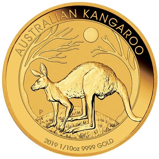- Złota moneta bulionowa Australijski Kangur to propozycja Perth Mint na 2019 rok. Moneta o próbie Au 9999 i wadze 1/10 uncji wyróżnia się charakterystycznym wzorem rewersu, na którym widnieje narodowy symbol Australii, kangur.