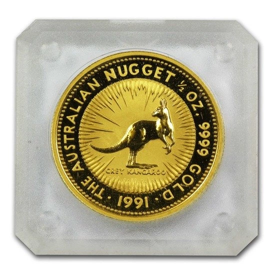 La pièce est frappée en or 24 carats d'une pureté de 9999 et pèse 1/2 once. Le précurseur de l'actuelle pièce australienne Kangourou était une pièce produite en 1986 appelée Australian Nugget. Son motif était basé sur l'image d'un nugget d'or. Peu de temps après, le motif a été remplacé par celui d'un kangourou, animal associé à l'Australie.