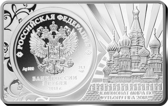 A set consisting of a 1 oz silver coin and a 2 oz bar dedicated to the FIFA World Cup in Russia. The set is individually numbered and comes in an elegant case with a certificate of authenticity. The limited edition of the set is 2,018 pieces worldwide. The reverse of the set features a beautiful championship cup, next to which is the inscription: “чемпионат мира по футболу фифа 2018 В россии” - FIFA World Cup 2018. At the bottom of the reverse side of the set there is an individual number and in the upper right corner there is information about the weight of the bar and the silver fineness “2 OZ AG .999”. On the obverse side there is an inscription: “2018 FIFA WORLD CUP RUSSIA”. The obverse side of the coin depicts the Russian coat of arms and the inscriptions: “3 PУБЛЯ” - denomination (three rubles), “БАНК РОССИИ” - country of issue (Bank of Russia), ‘2018’ - year of issue, “Ag 999” - silver fineness, and “31.1” - weight of the coin.