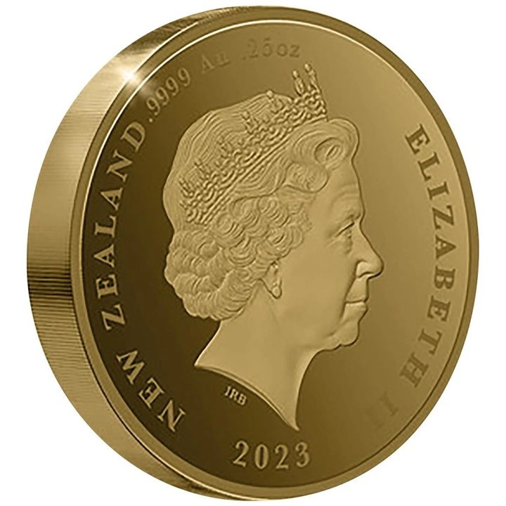 La pièce de collection Kiwi 1/4 oz Gold 2023 Proof est une pièce unique de la série Kiwi en édition limitée, émise depuis 2004. Le produit 2023 représente le membre méridional de la famille « Apteryx australis ». Cette espèce se trouve, entre autres, sur l'île Stewart, dans le Fiordland. Elle se caractérise par un plumage gris-brun avec des plumes allongées et rayées. La pièce est frappée en or pur Au.9999, pèse 1/4 d'once troy et a un diamètre de 26 mm. Elle est produite par BH Mayer's Kunstprägeanstalt GmbH, à la demande de la poste néo-zélandaise. Cette pièce unique est produite à l'aide d'un tampon miroir. De plus, le Kiwi 2022 est frappé en édition limitée à seulement 500 exemplaires. Il est important de noter que chaque pièce est livrée dans un étui exclusif accompagné d'un certificat d'authenticité numéroté. L'avers de la pièce représente la reine Elizabeth II coiffée d'une couronne. Il comporte également des informations sur la date d'émission, le pays d'émission, le poids et la pureté du métal. L'avers a été conçu par Ian Rank-Broadley. Le revers représente un kiwi sur une plage parmi les rochers. Le revers comporte également l'inscription « TOKOEKA SOUTHERN BROWN KIWI APTERYX AUSTRALIS » et la valeur faciale de la pièce. Le revers a été conçu par Stephen Fuller.Designer