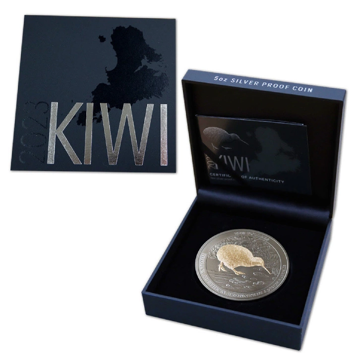 La pièce de collection Kiwi plaquée or 5 onces d'argent 2023 Black Proof est une pièce unique issue de la série limitée Kiwi émise depuis 2004. Le produit de 2023 représente le kiwi du sud de la famille « Apteryx australis ». Cette espèce est présente notamment sur l'île Stewart, dans le Fiordland. Elle se caractérise par un plumage gris-brun avec des plumes rayées longitudinalement. La pièce est frappée en argent pur Ag.999, pèse 5 onces troy et mesure 65 mm de diamètre. Elle est fabriquée en black proof par BH Mayer's Kunstprägeanstalt GmbH, à la demande de la New Zealand Post. La pièce est plaquée en or jaune. De plus, le Kiwi 2023 est frappé en édition limitée à seulement 300 exemplaires. Chaque pièce est livrée dans un étui exclusif. L'avers de la pièce est orné du portrait de la reine Elizabeth II. Il comporte également la date d'émission, le pays émetteur, le poids et la pureté du métal. Le designer de l'avers est Ian Rank-Broadley. Le revers représente un kiwi plaqué or sur une plage parmi des rochers. Le revers comporte également l'inscription « TOKOEKA SOUTHERN BROWN KIWI APTERYX AUSTRALIS » et la valeur nominale de la pièce. Le designer du revers est Stephen Fuller.Designer