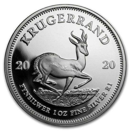 Les Krugerrands en argent sont frappés par la Monnaie sud-africaine Rand Refinery. Ils constituent un moyen de paiement à part entière, garanti par le gouvernement sud-africain en termes de légalité, de pureté du métal et d'origine du métal. Il est intéressant de noter que, bien que les Krugerrands soient une monnaie légale, ils n'ont pas de valeur monétaire. Cela signifie que la Banque de réserve sud-africaine est tenue de racheter les pièces au prix actuel du métal. L'avers est orné du portrait de Paul Kruger, tandis que la bordure comporte les mots « Afrique du Sud » en afrikaans et en anglais. Le revers représente un springbok, symbole de l'Afrique du Sud. De part et d'autre de l'animal figurent les chiffres représentant l'année de frappe, et en dessous, l'inscription « Fynsilwer 1oz fine silver r1 », indiquant la teneur en argent pur.