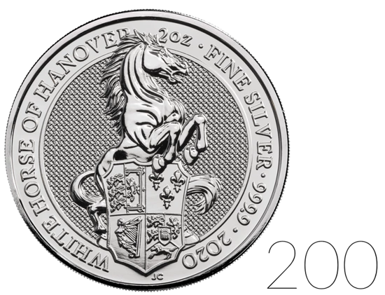 Les bêtes de la reine : Cheval blanc de Hanovre 2 onces d'argent LOT DE 200 PIÈCES 2020