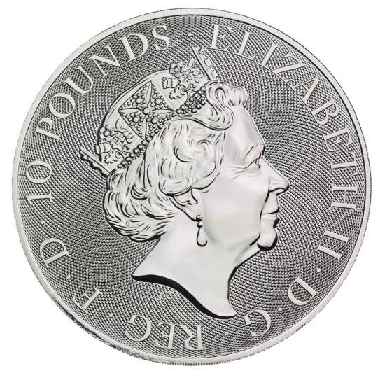 Le revers représente l'une des 10 bêtes de la reine : le lévrier blanc de Richmond. Le revers comporte également des informations sur le poids, la pureté du métal et l'année de frappe de la pièce. Le revers a été conçu par Jody Clark.