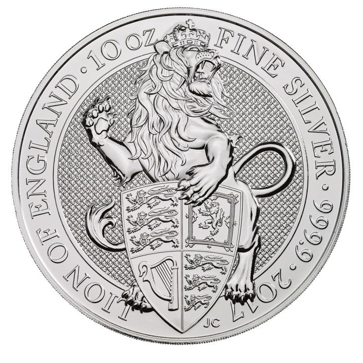 Rewers: przedstawia stylizowany wizerunek Angielskiego Lwa trzymającego tarczę Rodziny Królewskiej , a także informacje o wadze (10 oz), próbie (0.9999 Ag) i roku bicia (2017).