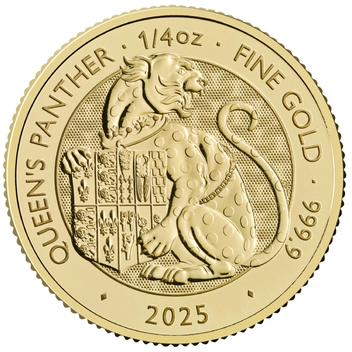 La pièce « The Royal Tudor Beasts : The Queen's Panther » 1/4 once d'or 2025 est la sixième pièce de la série « The Royal Tudor Beasts ». Cette pièce met en valeur la riche héraldique de la dynastie Tudor à travers son design. Inspirée des sculptures du Moat Bridge à Hampton Court Palace, elle symbolise l'union célèbre d'Henri VIII et de sa troisième épouse, Jane Seymour. La panthère du Moat Bridge est la dernière bête royale que les visiteurs rencontrent avant d'entrer dans le palais. La série complète comprendra 10 pièces représentant des animaux : le lion d'Angleterre, le taureau de Clarence, le dragon Tudor, le lévrier de Richmond, le dragon royal, le yale de Beaufort, la licorne Seymour, la panthère de la reine, The Queen’s Lion et Seymour Panther. La pièce est frappée en or pur Au.9999, pèse 1/4 d'once troy et mesure 22 mm de diamètre. Le tirage de la pièce est illimité. De plus, cet exemplaire exceptionnel a été produit par la Monnaie royale. L'avers représente l'effigie du roi Charles III de Grande-Bretagne et la valeur nominale, selon le dessin de Martin Jennings.