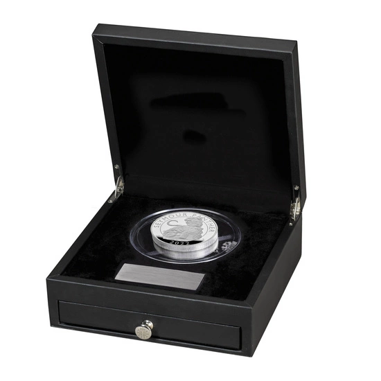 La pièce « The Royal Tudor Beasts : Seymour Panther » en argent de 10 onces 2022 Proof est la première pièce de la série « The Royal Tudor Beasts ». Cette pièce de collection représente l'une des dix bêtes héraldiques royales. Elle commémore le mariage d'Henri VIII et de Jane Seymour. Ce produit constitue un début intéressant pour la série et permet de s'intéresser à l'histoire de la Grande-Bretagne. La série complète comprendra 10 pièces représentant des animaux : The Lion of England, le taureau de Clarence, le dragon Tudor, le lévrier de Richmond, le dragon royal, le yale de Beaufort, la licorne Seymour, la panthère de la reine et le lion de la reine. La pièce est frappée en argent pur Ag.999, pèse 10 onces troy et mesure 65 mm de diamètre, en qualité proof. De plus, cet exemplaire exceptionnel a été produit par la Monnaie royale. Il est présenté dans un emballage individuel certifié. L'avers de la pièce représente l'effigie de la reine Elizabeth II et indique la valeur nominale de la pièce. L'avers a été conçu par Jody Clark.