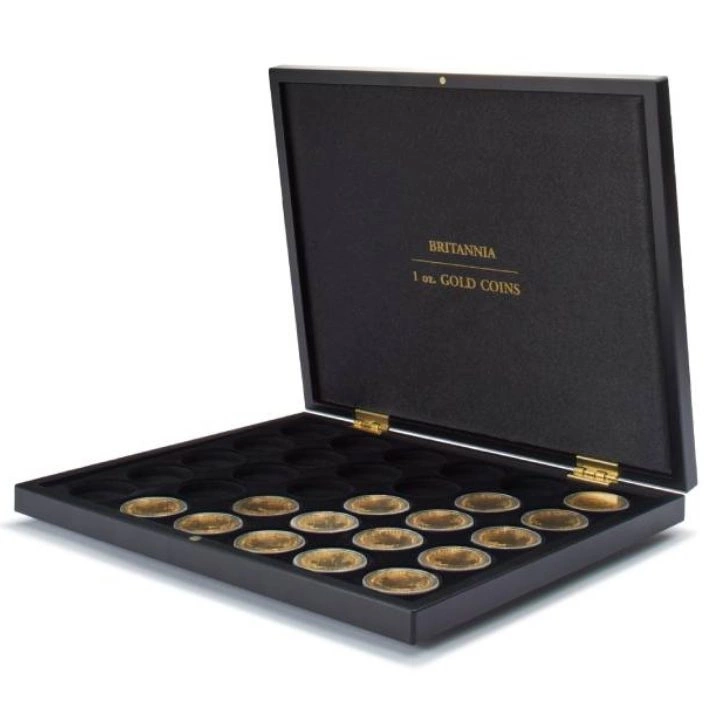 Leuchtturm - La cassette Britannia 30 x 1 once d'or est un produit unique destiné au rangement de 30 pièces d'or de la série Britannia, d'un poids de 1 once troy, dans des capsules en plastique. Le produit mesure 305 x 30 x 245 mm. Le couvercle et l'intérieur du coffret sont ornés de l'inscription dorée « BRITANNIA 1 OZ. GOLD COINS » et représentent l'avers et le revers de la pièce d'or Britannia. L'intérieur de l'étui est recouvert de satin. La cassette est dotée d'une fermeture magnétique et a été fabriquée par Leuchtturm. Le produit ne contient pas de pièces.Entité responsable de ce produit dans l'UE