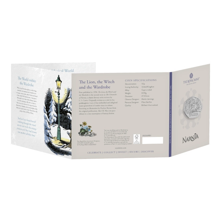 Le Lion, la Sorcière blanche et l'Armoire magique 50p Cupronickel 2023 est une pièce unique qui fait référence à la série fantastique classique de C.S. Lewis. Le roman « Le Lion, la Sorcière blanche et l'Armoire magique » raconte l'histoire des quatre frères et sœurs Pevensie : Peter, Suzanne, Edmund et Lucie, qui entrent dans une armoire et commencent une aventure dans le pays magique de Narnia. La pièce est frappée dans un alliage de cuivre et de nickel, pèse 8 grammes et mesure 27,30 mm de diamètre. Le tirage de la pièce est illimité. De plus, cet exemplaire exceptionnel a été produit par la Monnaie royale britannique. La pièce bénéficie de la garantie du gouvernement britannique quant à sa légalité, la pureté du métal et l'origine du métal, et est également un moyen de paiement légal sur le territoire du pays émetteur. L'avers représente l'effigie du roi Charles III du Royaume-Uni, ainsi que la valeur nominale et l'année, selon le dessin de Martin Jennings. Le revers de la pièce représente la faune de Mr Tumnus et Lucy, ainsi que l'inscription « THE LION, THE WITCH AND WARDROBE ». Le revers a été conçu par Ffion Gwillim.Designer