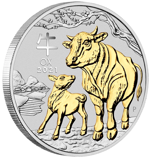 Lunar III : Année du Buffle 1 once d'argent 2021 Plaquée or (sans étui)