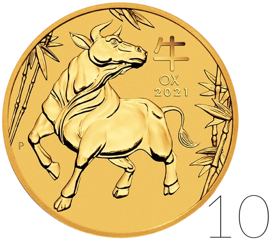 Lunar III : Année du Buffle 1 once d'or LOT DE 10 PIÈCES 2021