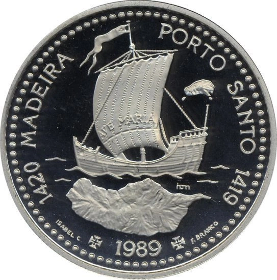 L'avers représente les armoiries du Portugal superposées à la croix de l'Ordre du Christ (Real Ordem dos Cavaleiros de Nosso Senhor Jesus Cristo). Le revers représente une caravelle sur une carte de l'archipel, avec Madère en dessous du bateau et Porto Santo au-dessus. Les dates des découvertes portugaises dans la région (les îles étaient déjà connues des Grecs et des Phéniciens) et la date de la pièce sont indiquées en dessous.