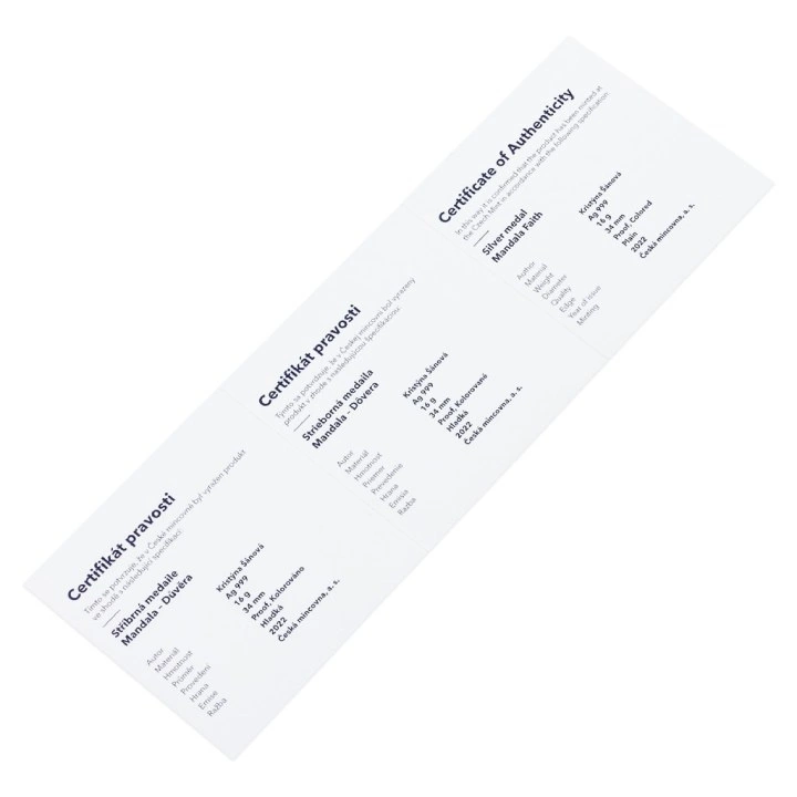 La médaille Mandala Faith colorée en argent 2022 Proof est la septième médaille de la série « The Gift Series », qui constituera un excellent cadeau pour toutes les occasions. Le produit est orné d'un mandala sur le thème de la « confiance ». Les mandalas prennent la forme d'un motif circulaire avec un centre et présentent des formes symétriques. L'exemplaire a été frappé dans un métal pur de titre Ag.999, d'un poids de 16 grammes, d'un diamètre de 34 mm, en qualité proof. La pièce a été conçue par Kristýna Šánová et produite par la Monnaie tchèque. Elle est garantie quant à sa légalité, pureté du métal et l'origine du métal. Le produit est livré dans son coffret d'origine avec un certificat d'authenticité. L'avers présente des motifs « Mandala » en argent. Le revers représente une « Mandala » colorée, qui symbolise la « confiance », et contient en outre un cristal de verre.Besoin d'aide ? Avez-vous des questions ?Posez votre question et nous vous répondrons rapidement. Les questions et les réponses les plus intéressantes seront publiées pour que d'autres puissent les consulter.