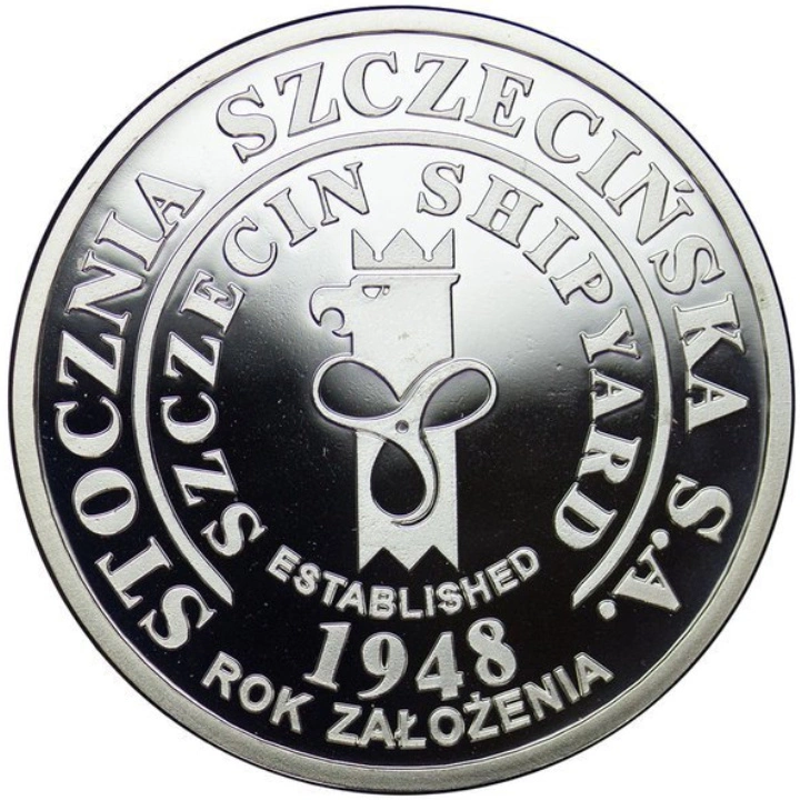 La médaille en argent « Stocznia Szczecińska - 600 Statków Zwodowanych Srebro 1999 Proof » (Chantier naval de Szczecin - 600 navires mis à l'eau, argent 1999, qualité proof) célèbre la mise à l'eau de 600 navires au chantier naval de Szczecin. Les médailles sont une forme d'investissement classique et sûre, connue et appréciée par les investisseurs du monde entier. Le produit est fabriqué en argent pur Ag.925, pèse 31,1 grammes et est de qualité proof. L'avers est orné du logo du chantier naval de Szczecin. Le revers représente un navire de transport et l'inscription « 600 STATKÓW ZWODOWANYCH » (600 navires mis à l'eau).Emballage