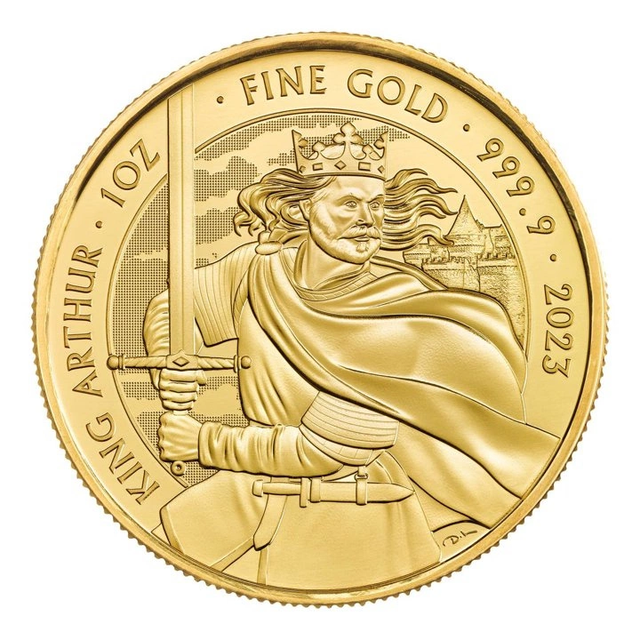 La pièce en or King Arthur 1 once d'or 2023 représente le souverain de la Grande-Bretagne historique, le roi Arthur, héros d'innombrables légendes, œuvres littéraires et films. Il est notamment connu pour le célèbre ouvrage « Les Chevaliers de la Table ronde ». Cette pièce est le premier exemplaire de la deuxième série Myths & Legends. Elle est frappée dans un métal pur de titre Au.9999, pèse une once troy et mesure 32,69 mm de diamètre. Elle est émise par The Royal Mint, un fabricant de métaux précieux réputé et fiable. Il est important de noter que cette pièce en or est frappée en quantité illimitée. Elle est garantie par le gouvernement britannique et fait office de moyen de paiement officiel sur le territoire du pays émetteur. De plus, les pièces individuelles sont expédiées dans des capsules de protection. L'avers représente le portrait de la reine Elizabeth II couronnée. La valeur nominale de la pièce figure également sur l'avers. L'avers a été conçu par Jody Clark. Le revers de la pièce en or représente l'image du roi Arthur tenant une épée dans sa main, avec le château de Camelot en arrière-plan. Le revers comporte des informations sur le poids et la pureté du métal, ainsi que l'année de frappe de la pièce et l'inscription « KING ARTHUR ». Le revers a été conçu par David Lawrence.Designer