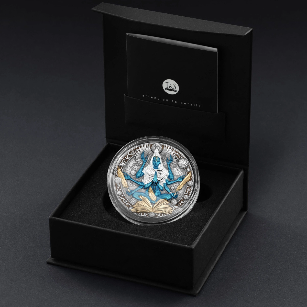 Niue : Cobellian coloré/plaqué or 2 onces d'argent 2025 Antiqued Coin est une pièce de collection unique représentant Cobellian, fondateur de l'Ordre Stride, maître cosmique de la connaissance et de la création. Frappée dans 2 onces d'argent pur 999 en qualité antique, avec un placage et une coloration sélectifs, la pièce a un diamètre de 45 mm, un poids de 62,2 g, une valeur nominale de 5 dollars et a été émise par Niue en 2025 dans un tirage de 500 exemplaires. Chaque exemplaire est livré dans un élégant étui accompagné d'un certificat d'authenticité. La pièce symbolise la découverte de l'inconnu, la créativité et le courage, en présentant Cobelliana dans une composition dynamique avec huit mains en mouvement, exprimant le pouvoir de la création et de l'exploration. Chaque détail a été soigneusement réalisé et le relief contrasté donne vie et profondeur au personnage. L'avers représente les armoiries de Niue ainsi que la valeur nominale, le poids et la pureté de l'argent, et l'année d'émission, 2025. Ces éléments sont placés sur un fond inspiré de l'Ordre de Stride, et dans la partie inférieure figurent un livre et une plume, symbolisant la connaissance et la science. L'ensemble forme une composition harmonieuse et artistique, digne d'un collectionneur. Le revers montre Cobelliana dans une pose dynamique, les huit bras en mouvement, symbolisant la créativité et les découvertes. La composition est complétée par des éléments géométriques faisant référence à la discipline de l'Ordre de Stride. Le design met l'accent sur le pouvoir de la création et l'imagination artistique, alliant narration et précision numismatique.Besoin d'aide ? Avez-vous des questions ?Posez votre question et nous vous répondrons rapidement. Les questions et les réponses les plus intéressantes seront publiées pour que d'autres puissent les consulter.