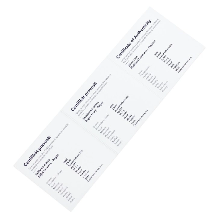 La pièce Niue : Mythical Creatures - Pegasus 2 Silver 2022 Proof est la onzième pièce de la série « Mythical Creatures ». Elle représente le cheval ailé mythique grec Pégase. Dans la mythologie grecque, il s'agit d'un cheval ailé né du sang de Méduse après sa mort aux mains de Persée. La pièce a été frappée dans un métal pur de titre Ag.999, d'un poids de 31,1 grammes, d'un diamètre de 37 mm, en qualité proof. Le produit est tiré à seulement 1 000 exemplaires. Cette pièce unique a été conçue par Asamat Baltaev, DiS, et frappée par la Monnaie tchèque. Elle est également un moyen de paiement officiel sur le territoire de Niue. La pièce est garantie quant à sa légalité, la pureté du métal et son origine. Le produit est livré dans son coffret d'origine avec un certificat d'authenticité. L'avers de la pièce est orné du portrait de la reine Elizabeth II, de l'inscription « NIUE ISLAND » ainsi que de la valeur faciale et de l'année de la pièce. L'avers a été conçu par Ian Rank-Broadley. Le revers représente l'image de Pégase avec ses ailes et des ornements décoratifs. L'inscription « PEGASUS » figure également au revers.Designer
