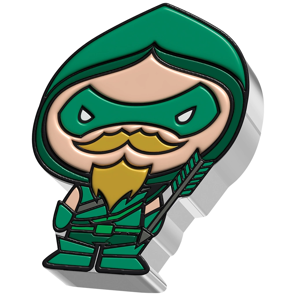 Revers représente Green Arrow dans le style Chibi, avec des proportions exagérées et une expression caractéristique, soulignant son caractère unique et l’attrait de la pièce pour les fans et les collectionneurs.