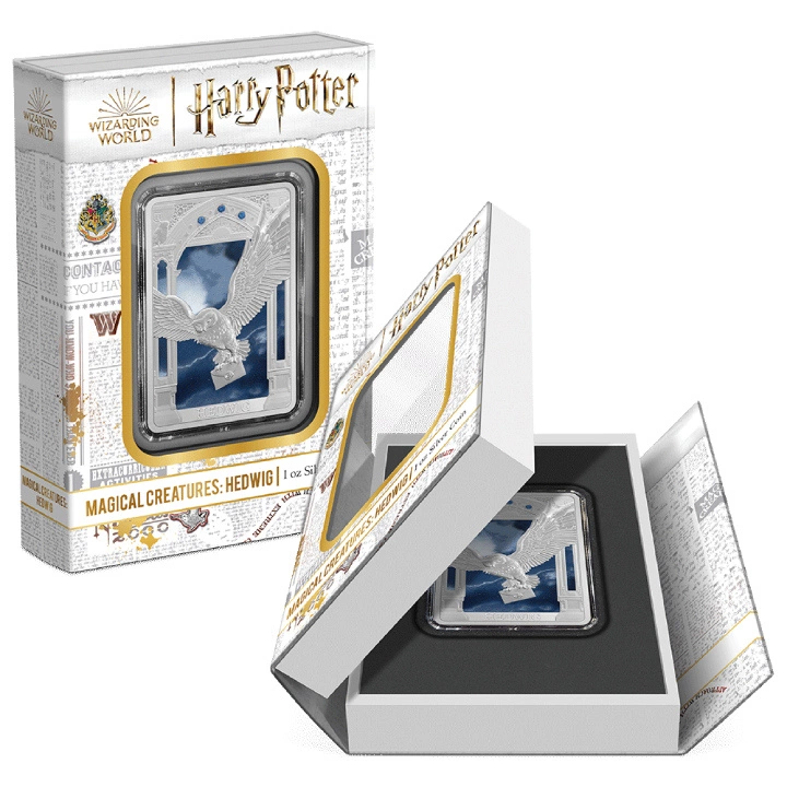 Niue : Harry Potter - Magical Creatures « Hedwiga » colorée 1 once d'argent 2023 Proof Proof est une pièce en argent qui a été créée en collaboration avec Warner Bros. Consumer Products et qui représente la chouette Hedwiga. Le revers de la pièce comporte trois zircons bleu foncé. Cette émission unique est strictement limitée à 2 000 exemplaires. La pièce en argent est frappée dans un métal pur de titre Ag.999, pèse 1 once troy et mesure 36 mm x 53 mm, dans la norme proof. Elle est produite par le célèbre fabricant de pièces de monnaie New Zealand Mint. De plus, chaque exemplaire est garanti par le gouvernement néo-zélandais et constitue un moyen de paiement légal sur le territoire du pays émetteur. L'avers représente les armoiries de Niue ainsi que des informations sur la valeur nominale, l'année de frappe, le poids et la pureté du métal. Le revers montre une image colorée d'une chouette et l'inscription « HEDWIG ».Fabricant