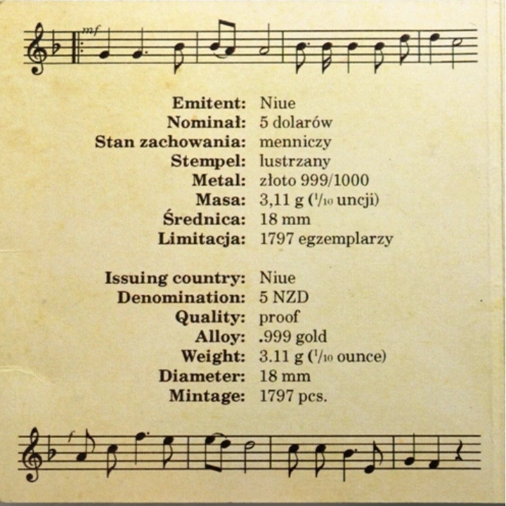 Niue : Mazurek Dąbrowskiego 1/10 once d'or 2022 Proof est une pièce numismatique unique commémorant l'un des symboles les plus importants de l'identité polonaise : l'hymne national polonais. La pièce en or a été frappée en or pur Au.999, avec un poids de 1/ 10 onces troy et d'un diamètre de 18 mm, en qualité proof. Il s'agit d'une pièce dont le tirage imité est de 1 797 exemplaires. De plus, chaque pièce a cours légal et bénéficie de la garantie du gouvernement de Niue quant à sa légalité, la pureté du métal et son origine. Le produit est présenté dans son emballage d'origine. L'avers de la pièce en or représente les armoiries de Niue ainsi que la valeur nominale, l'année de frappe et le pays émetteur. Le revers représente une image stylisée du général Jan Henryk Dąbrowski et comporte les inscriptions « MAZUREK DĄBROWSKIEGO » et « POLISH NATIONAL ANTHEM ».Besoin d'aide ? Avez-vous des questions ?Posez votre question et nous vous répondrons rapidement. Les questions et les réponses les plus intéressantes seront publiées pour que d'autres puissent les consulter.
