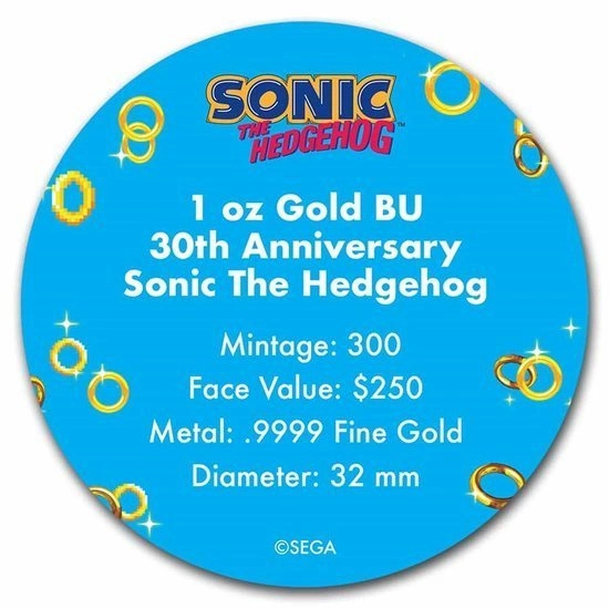 Niue : Sonic The Hedgehog 1 once d'or 2021 est une pièce d'or qui peut enrichir le portefeuille de collection et d'investissement d'un acheteur. La pièce célèbre et commémore le 30e anniversaire de Sonic The Hedgehog, le jeu vidéo mettant en scène un hérisson bleu, Sonic. Il est important de noter que cette émission unique est strictement limitée à 300 exemplaires. Niue : Sonic The Hedgehog 1 once d'or 2021 est frappée dans un métal pur de titre Au.9999, d'un poids d'une once troy et d'un diamètre de 39 mm. Chaque pièce est placée dans une capsule et dans un étui original. L'avers de la pièce d'or représente les armoiries de Niue (Public Seal of Niue). L'avers comporte également des informations sur le poids, la pureté du métal, la valeur nominale, l'année de frappe, ainsi que l'inscription « SEGA », qui est le fabricant du jeu vidéo. Le revers de la pièce d'or représente l'image de Sonic et le logo du 30e anniversaire.Besoin d'aide ? Avez-vous des questions ?Posez votre question et nous vous répondrons rapidement. Les questions et les réponses les plus intéressantes seront publiées pour que d'autres puissent les consulter.