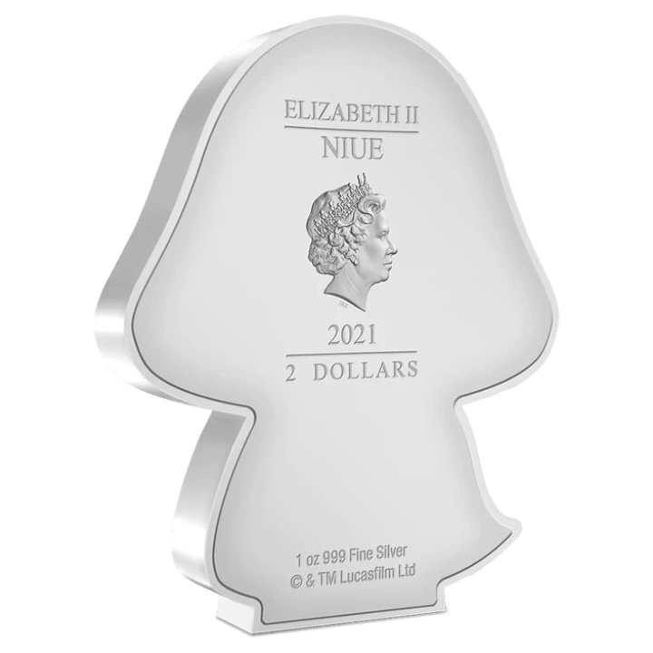 Niue : Star Wars - Chibi « Kylo Ren » coloré 1 once d'argent 2021 Proof est une pièce représentant le Maître du Premier Ordre, Kylo Ren. La pièce en argent Star Wars est un véritable régal pour les fans de la série culte de George Lucas qui recherchent un investissement sûr et éprouvé. Les pièces ont été frappées en argent pur Ag.999 d'un poids de 1 once troy et de dimensions 29,2 mm x 36 mm, dans la norme proof. Le tirage du produit est de 2 000 pièces. Le fabricant des pièces est la Monnaie de Nouvelle-Zélande. Les pièces ont cours légal sur le territoire du pays émetteur. L'avers de la pièce en argent représente l'effigie de la reine Elizabeth II, avec les inscriptions « ELIZABETH II » et « NIUE ». L'avers comporte des informations sur la valeur nominale, le poids, la pureté du métal, l'année d'émission et les droits d'auteur appartenant à Lucasfilm Ltd. L'avers a été conçu par Ian Rank-Broadley. Le revers représente une image colorée de Kylo Ren.Fabricant
