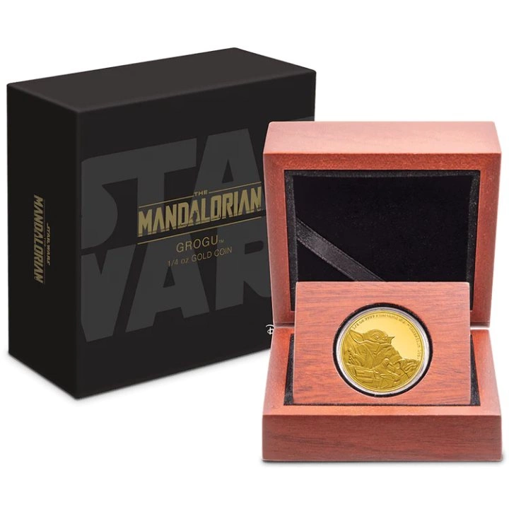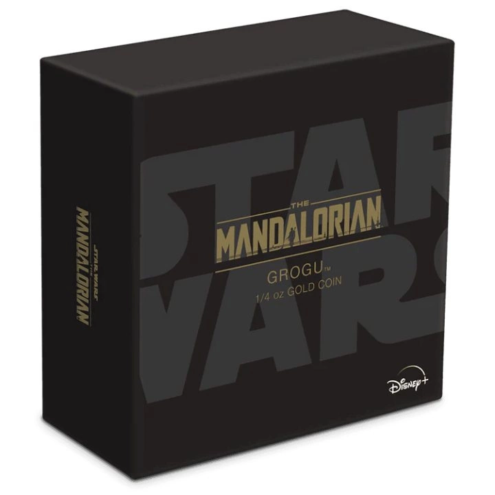 Niue : Star Wars The Mandalorian – Grogu 1/4 once d'or 2022 Proof est une pièce de la série « The Mandalorian » qui représente Grogu, communément appelé Baby Yoda. Le personnage apparaît dans la série « The Mandalorian » produite par Lucasfilm Ltd. La pièce en or Star Wars est un véritable régal pour les fans de la série culte de George Lucas qui recherchent un investissement sûr et éprouvé. La pièce a été frappée dans un métal pur de titre Au.9999, d'un poids de 1/4 d'once troy, d'un diamètre de 22 mm, dans la norme proof. Il s'agit d'une pièce dont le tirage est limité à seulement 500 exemplaires. Elle est produite par la Monnaie de Nouvelle-Zélande. De plus, chaque pièce de la collection a cours légal et bénéficie de la garantie du gouvernement de Niue quant à sa légalité, la pureté du métal et son origine. L'avers de la pièce représente l'effigie de la reine Elizabeth II, l'inscription « ELIZABETH II », « NIUE » ainsi que la valeur nominale et l'année d'émission de la pièce. L'avers a été conçu par Ian Rank-Broadley. Le revers représente Grogu dans les bras de son tuteur, le Mandalorien, ainsi que des informations sur le poids et la pureté du métal et les droits d'auteur appartenant à Lucasfilm Ltd.Fabricant