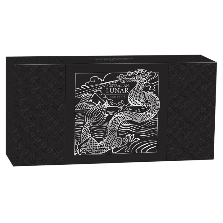 Perth Mint: Lunar III - Year of the Dragon: Set of 3 coins Silver 2024 Proof is a unique set of three coins from the Lunar III series. The coins and the entire series were produced by The Perth Mint, a leading manufacturer of investment and collector's items. The coins are guaranteed by the Australian government and are legal tender in the country of issue. Previous coins in the series were the Year of the Rat 2020, the Year of the Ox 2021, the Year of the Tiger 2022, and the Year of the Rabbit 2023. The Lunar series refers to the 12 animals that represent the Chinese lunar calendar. The year 2024 belongs to the dragon, which in Chinese mythology is a majestic beast inhabiting rivers, lakes, oceans, and wandering the sky. The Chinese zodiac sign of the dragon falls in the years: 1928, 1940, 1952, 1964, 1976, 1988, 2000, 2012, and 2024. All Lunar III coins enjoy extraordinary popularity every year among both investors and collectors, and the design of the coins is prepared with the utmost care and precision by world-renowned designers. It is worth remembering that products that are part of the lunar collection are an excellent investment, due to their investment value increasing year on year. The set includes: Lunar III: Year of the Dragon 2 oz Silver 2024 Proof, weighing 2 troy ounces and with a diameter of 50.8 mm, Lunar III: Year of the Dragon 1 oz Silver 2024 Proof, weighing 1 troy ounce and measuring 40.9 mm in diameter, and Lunar III: Year of the Dragon 1/2 oz Silver 2024 Proof, weighing 1/2 troy ounce and measuring 32.6 mm in diameter. The silver coins were minted in Ag.9999 fineness, in proof standard. The set comes with a numbered certificate of authenticity and original packaging. The obverse of the Year of the Dragon coins features the image of Queen Elizabeth II and the inscriptions “ELIZABETH II” and “AUSTRALIA”. Additionally, the obverse side features information about the coin's face value, weight, and fineness. The reverse side depicts a Chinese dragon. The reverse also features the Chinese character for “dragon,” the inscription “DRAGON 2024,” and the letter “P,” which is the mark of The Perth Mint.Besoin d'aide ? Avez-vous des questions ?Posez votre question et nous vous répondrons rapidement. Les questions et les réponses les plus intéressantes seront publiées pour que d'autres puissent les consulter.
