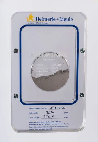 (Rhodium ) jest twardym, odblaskowym, srebrno-białym metalem. Jego wysoka wytrzymałość oraz trwałość sprawia, iż ma on wiele zastosowań w procesach przemysłowych. Warto dodać, iż cechuje go niezdolność reagowania z wodą, powietrzem i kwasami, natomiast podlega reakcji z mocnymi zasadami.Prezentowany produkt znajduje się w certyfikowanym opakowaniu w postaci proszku. Za stworzenie tego niezwykłego produktu odpowiada mennica Heimerle + Meule GmbH, która jako jedna z nielicznych zajmuje się produkcją wyrobów stanowiących alternatywną formę lokowania kapitału. Całość posiada wagę 50 gramów oraz czystość kruszcu Rh .9995.Rzadkość występowania tego metalu na rynku metali szlachetnych sprawia, iż posiada on niesztampowy potencjał inwestycyjny.