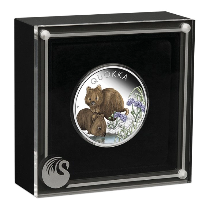La pièce en argent représentant l'adorable Kuoka est une proposition d'investissement provenant de la célèbre monnaie australienne The Perth Mint. Le Kuoka (Quokka) est un petit marsupial de la famille des kangourous, qui vit dans le sud-ouest de l'Australie et sur les îles Rottnest et Bald. Son museau extrêmement charmant et son attitude amicale envers les humains ont assuré au Kuoka une grande popularité sur les réseaux sociaux, où les touristes publient leurs selfies avec cet animal. La pièce en argent colorée représentant le Kuoka (Quokka) a été frappée en métal pur de titre Ag.9999, d'un poids d'une once troy et d'un diamètre maximal de 40,9 mm, en qualité proof. Cette pièce est la troisième de la série Quokka. Cette pièce unique est un produit haut de gamme dont le tirage est limité à 5 000 exemplaires. La Kuoka en argent est livrée dans son emballage d'origine et est un moyen de paiement à part entière dans le pays de l'émetteur. Elle bénéficie de la garantie du gouvernement australien. L'avers représente le portrait de la reine Elizabeth II, dessiné par Jody Clark. L'ensemble est entouré de l'inscription « Elizabeth II Australia » et des informations sur le poids, la pureté du métal et la valeur nominale de la pièce. Le revers représente deux kookaburras colorés près d'un réservoir d'eau entouré de rochers et de marguerites de l'île de Rottnes. Outre l'image captivante de l'animal le plus sympathique du monde, le revers comporte une sécurité sous la forme d'une lettre « P » micro-gravée. Le revers a été conçu par Sean Rogers.Besoin d'aide ? Avez-vous des questions ?Posez votre question et nous vous répondrons rapidement. Les questions et les réponses les plus intéressantes seront publiées pour que d'autres puissent les consulter.