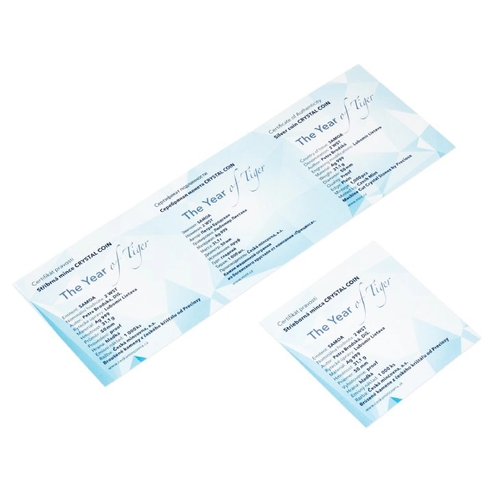 La pièce Samoa : Crystal Coin - The Year of Tiger 2 Silver 2022 Proof est une pièce qui représente le tigre, l'un des 12 animaux du calendrier lunaire chinois. Le tigre symbolise le courage, la force et est considéré comme le roi des animaux. De plus, le revers est recouvert de cristaux provenant du fabricant de verre tchèque Preciosa. La pièce a été frappée dans un métal pur de titre Ag.999, d'un poids de 31,1 grammes, d'un diamètre de 50 mm, dans la norme proof. Le produit est disponible en seulement 1 000 exemplaires. Cette pièce unique a été conçue par Petra Brodská, DiS, et produite par la Monnaie tchèque. Elle est également un moyen de paiement officiel au Samoa. La pièce est garantie quant à sa légalité, la pureté du métal et l'origine du métal. Le produit est livré dans son coffret d'origine avec un certificat d'authenticité. L'avers de la pièce est orné du portrait de la reine Elizabeth II, du blason des Samoa, des douze animaux du calendrier chinois et comporte des informations sur l'année de frappe et la valeur nominale de la pièce. L'avers a été conçu par Ian Rank-Broadley. Le revers représente l'image d'un tigre. Le revers comporte neuf cristaux orange et les inscriptions « ROK TYGRA », « YEAR OF THE TIGER » et un caractère chinois.Designer