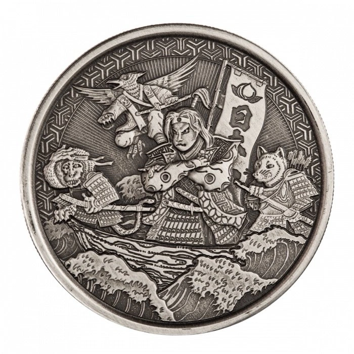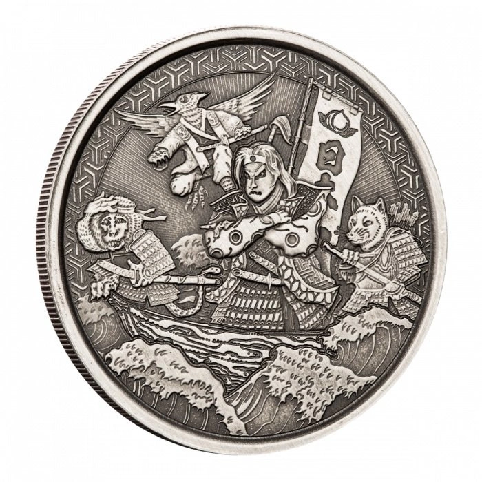 Samoa : Légendes du Japon - Momotaro sur l'île des démons dans le style ukiyo-e 1 once d'argent 2021 Pièce vieillie