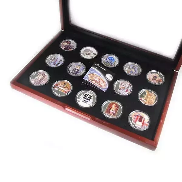 Le set de 14 pièces : Via Dolorosa colorée 14 x 1 once d'argent 2016 Prooflike est un exemplaire unique qui contient des pièces numismatiques spécialement sélectionnées. La « Via Dolorosa » (lat. « Chemin de la Douleur ») est une rue historique réelle située dans l'enceinte de la vieille ville de Jérusalem. On considère généralement qu'il s'agit du chemin emprunté par Jésus, depuis son procès jusqu'à sa crucifixion et son enterrement. Le set de pièces colorées comprend les 14 stations du chemin de croix. Les pièces sont frappées en argent Ag.999, pèsent 1 once troy, ont un diamètre de 39 mm, sont de qualité prooflike et sont disponibles en édition limitée à 999 exemplaires. Les pièces sont présentées dans un emballage individuel en bois. De plus, ces pièces exceptionnelles ont été produites par la Monnaie de Terre Sainte. Les pièces sont garanties par le gouvernement israélien quant à leur légalité, la pureté du métal et son origine. Les avers représentent la vieille ville de Jérusalem et portent les inscriptions « VIA DOLOROSA », « THE HOLY CITY » et « JERUSALEM » ainsi que le logo « The Holy Land Mint ». Les revers représentent les 14 stations colorées du « Chemin de Croix ». Les revers ont été conçus par Ruben Nutels.Fabricant
