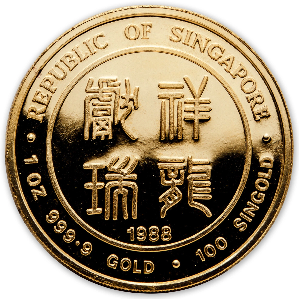 Year of the Dragon 1 once d'or 1988 est une pièce unique frappée par la Singapore Mint, commémorant l'année du Dragon selon le calendrier lunaire chinois. Cette émission allie l'or pur de la plus haute qualité à un magnifique motif symbolique. Avers : Quatre caractères chinois symbolisant « la gentillesse, le succès et la prospérité », accompagnés de l'inscription « REPUBLIC OF SINGAPORE » et de l'année d'émission 1988. De plus, le poids et la pureté sont indiqués : 1 OZ 999.9 GOLD et la valeur nominale 100 SINGOLD. Revers : un dragon volant vers la gauche, représenté dans une composition dynamique et élégante, symbolisant la puissance et le bonheur. La pièce pèse 31,1061 g, a un diamètre de 32,1 mm et une épaisseur de 2,6 mm. Elle présente un bord dentelé et a été fabriquée selon la technique milled à partir d'or pur d'une pureté de 9999. C'est un objet de grande valeur tant pour les collectionneurs que pour les investisseurs.Emballage