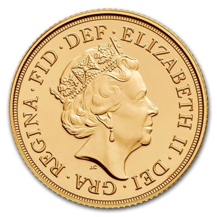 Rewers przedstawia scenę zabicia smoka przez świętego Jerzego. Ilustrację zaprojektował Benedetto Pistrucci. Na dole złotej monety podana jest również data emisji.