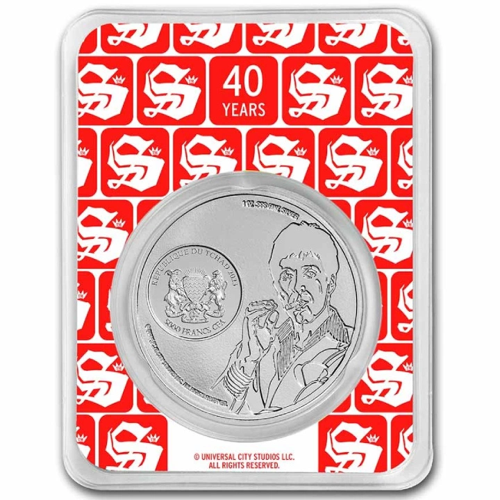 Tchad : L'homme à la cicatrice - 40e anniversaire du film 1 once d'argent 2023 est une pièce en argent qui peut enrichir le portefeuille de collection et d'investissement d'un acheteur. La pièce célèbre et commémore le 40e anniversaire du film « L'homme à la cicatrice ». Il s'agit d'un drame policier américain de 1983 réalisé par Brian De Palma et écrit par Oliver Stone. La pièce est frappée dans un métal pur de titre Ag.999, d'un poids d'une once troy et d'un diamètre de 39 mm. Il est important de noter que cette émission unique est strictement limitée à 2 000 exemplaires. Chaque pièce est garantie par le gouvernement tchadien et a cours légal sur le territoire du pays émetteur. L'avers de la pièce en argent représente les armoiries du Tchad et l'effigie d'Ony Montana (Al Pacino). L'avers comporte également des informations sur le poids, la pureté du métal, la valeur nominale et l'année de frappe. Le revers comporte les inscriptions « SCARFACE » et « 40 YEARS ».Besoin d'aide ? Avez-vous des questions ?Posez votre question et nous vous répondrons rapidement. Les questions et les réponses les plus intéressantes seront publiées pour que d'autres puissent les consulter.