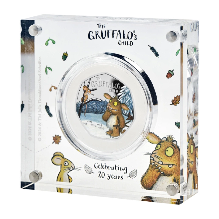 Créé par Julia Donaldson dans son style caractéristique rimé et magnifiquement illustré par Axel Scheffler, « Le Petit Gruffalo » est devenu un livre préféré de la littérature enfantine. Depuis deux décennies, il divertit non seulement les familles, mais offre également aux enfants et aux parents des souvenirs pour toute la vie. Le livre célèbre son 20e anniversaire depuis sa publication, et célèbre ce conte intemporel sur la pièce The Gruffalo's Child 2024 colorée 50p Argent 2024 Proof. La pièce est frappée en argent Ag.925, pèse 8 grammes, a un diamètre de 27,30 mm et est de qualité proof. Le tirage est de 7 500 exemplaires. De plus, cet exemplaire exceptionnel a été produit par la Monnaie royale britannique. Le produit est présenté dans son emballage d'origine. La pièce bénéficie de la garantie du gouvernement britannique quant à sa légalité, la pureté du métal et l'origine du métal, et est également un moyen de paiement légal sur le territoire du pays émetteur. L'avers représente le portrait du roi Charles III de Grande-Bretagne, ainsi que la valeur faciale et l'année, selon le dessin de Martin Jennings. Le revers de la pièce présente une illustration authentique et fidèlement reproduite tirée du livre « Le petit Gruffalo », en collaboration avec Magic Light Pictures et Axel Scheffler, ainsi que l'inscription « THE GRUFFALO'S CHILD ».Designer
