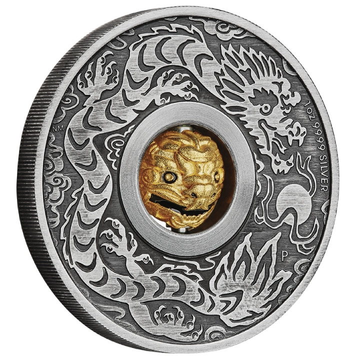 Tuvalu : Lunar III - Année du Dragon 1 once d'argent 2024 Breloque rotative Pièce vieillie