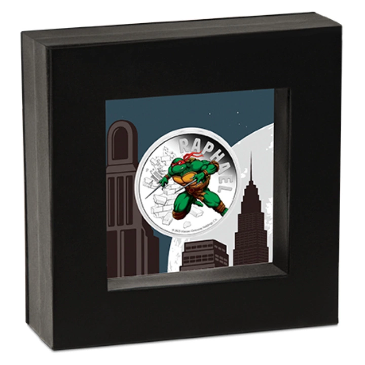 La moneta da collezione Tuvalu: Teenage Mutant Ninja Turtles - Raphael colorata da 1 oncia d'argento 2025 Proof è un'edizione limitata della serie delle avventure delle Tartarughe Ninja. Si tratta di un gruppo di supereroi che compaiono nei fumetti, nei film, nelle serie animate e nei videogiochi. Si tratta di quattro tartarughe antropomorfe: Leonardo, Donatello, Raphael e Michelangelo, che sono state mutate a seguito dell'esposizione a una sostanza tossica e, sotto l'influenza dell'arte ninjutsu insegnata loro da un ratto di nome Raphael, sono diventate guerrieri estremamente abili.L'esemplare unico del 2025 è una moneta coniata in argento puro Ag.9999, del peso di 1 oncia troy, in versione standard e in tiratura limitata di 5.000 pezzi. Il prodotto è stato realizzato dalla più antica zecca australiana, la Perth Mint, su commissione dello Stato di Tuvalu, pertanto il valore è garantito dal governo di Tuvalu.Il dritto raffigura il re Carlo III del Regno Unito, secondo il disegno di Jody Clark. Su di esso è riportata anche l'informazione sul valore nominale della moneta. Il rovescio della moneta d'argento raffigura il guerriero-ratto colorato Raphael e la scritta "RAPHAEL".Designer