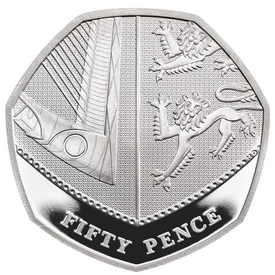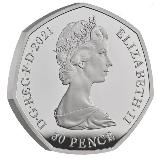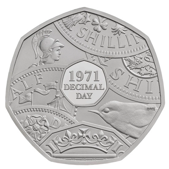 - A tizedesítés 50. évfordulója 50 pence alap Proof, az érme réz-nikkel ötvözetből készült, súlya 8 gramm, átmérője 27,3 mm, névértéke 50 pence.