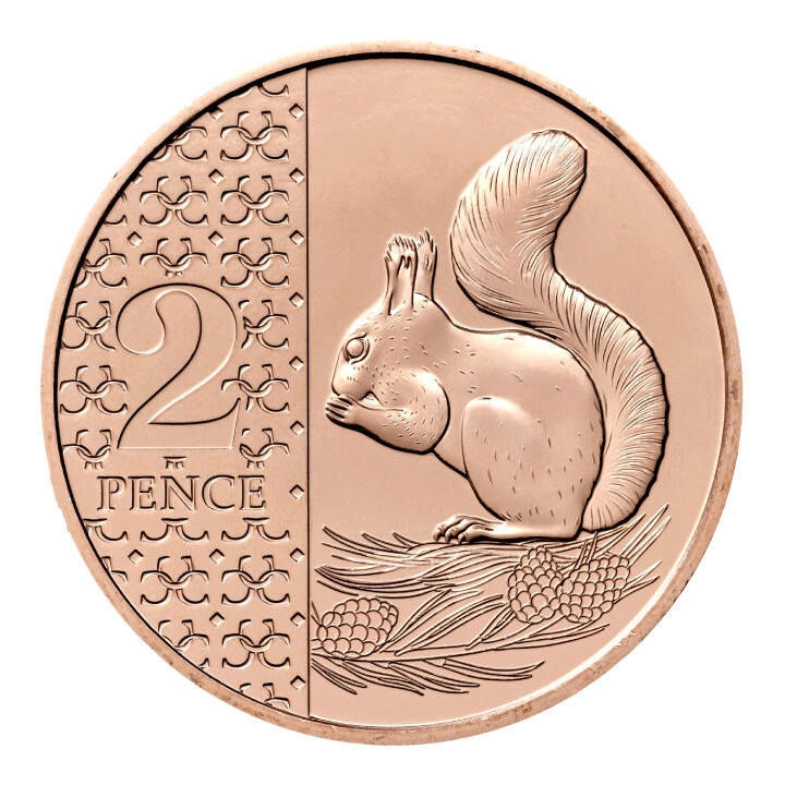 - 2 penny-s érme, amely rézbevonatú acélból készült, súlya 7,13 gramm, átmérője 25,91 mm.
