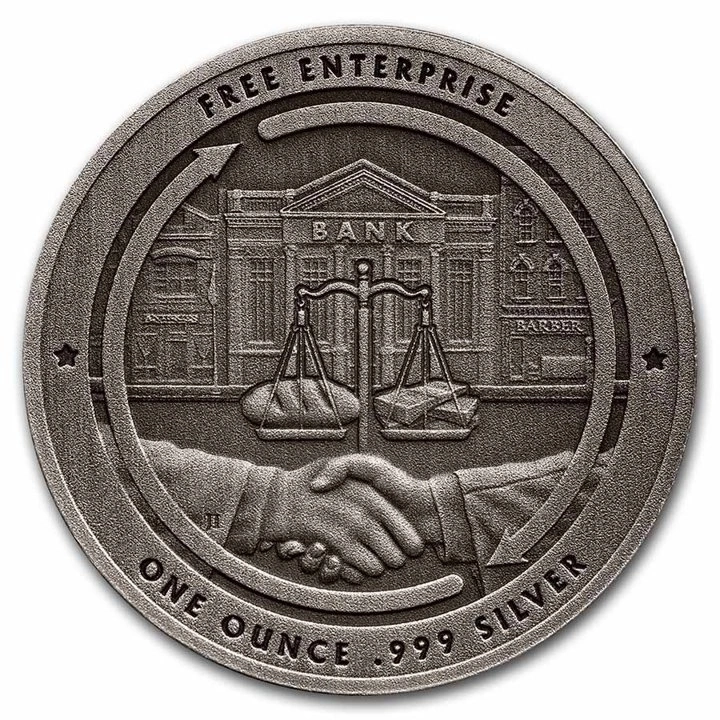 Az előlap egy kézfogást és egy mérleget ábrázol, háttérben egy kis üzletekkel teli várossal, kenyérrel és értékpapírokkal. Az előlapon szerepelnek a fém súlyára és tisztaságára vonatkozó információk, valamint a „FREE ENTERPRISE” felirat.