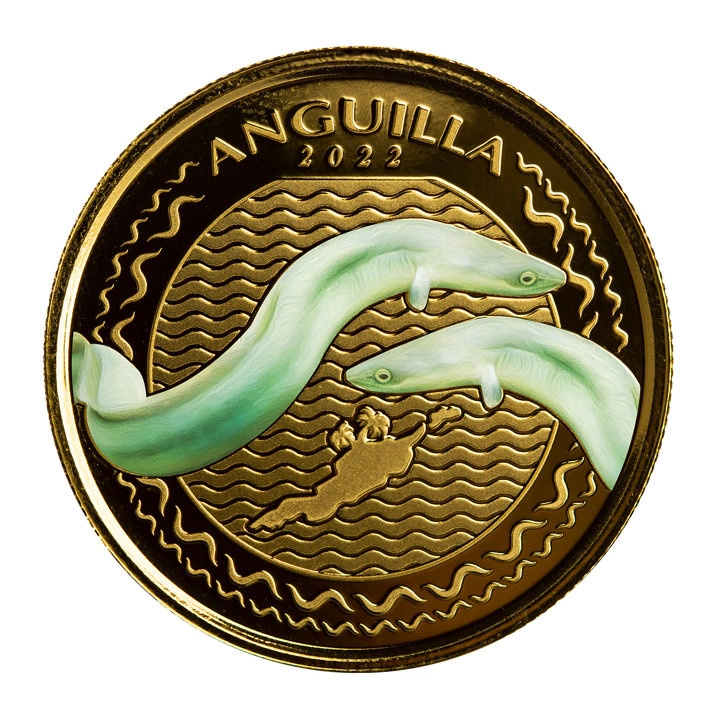 A hátoldalon két muréna látható. A hátoldalon az „ANGUILLA 2022” felirat is szerepel.