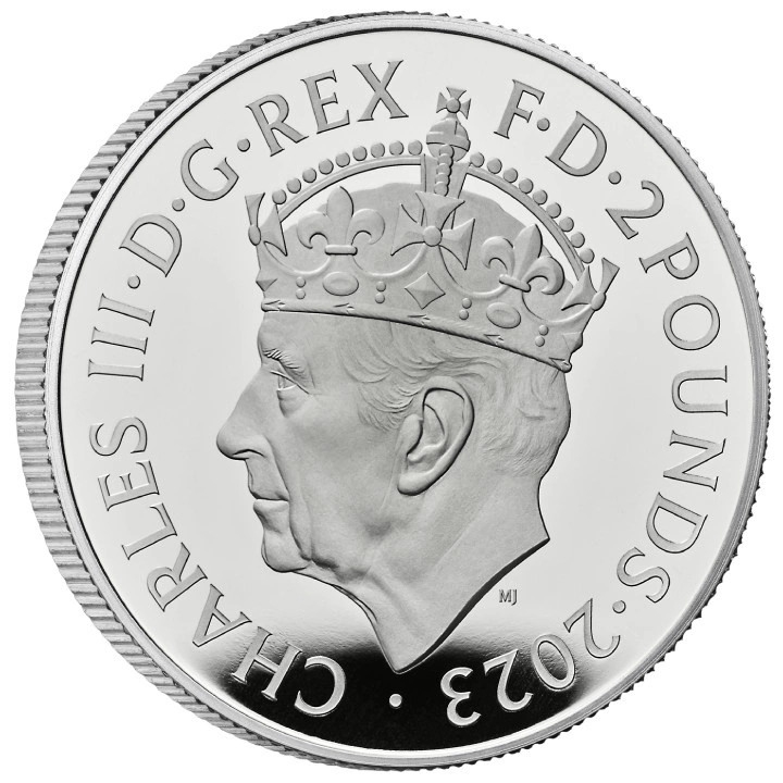 Az előlapon III. Károly brit király koronás arcképe, a „CHARLES III∙D∙G∙REX∙F∙D” felirat, valamint a névérték és az évszám látható, a tervező Martin Jennings.