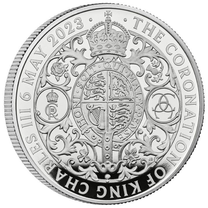 Az érme hátoldalán a koronával ellátott királyi címer látható, amelyet az Egyesült Királyság négy nemzetének virágos emblémáit tartalmazó díszek és a „THE CORONATION OF KING CHARLES III” (III. KÁROLY KIRÁLY KORONÁZÁSA) és „6 MAY 2023” (2023. MÁJUS 6.) feliratok vesznek körül. A hátoldal tervezője John Bergdahl.
