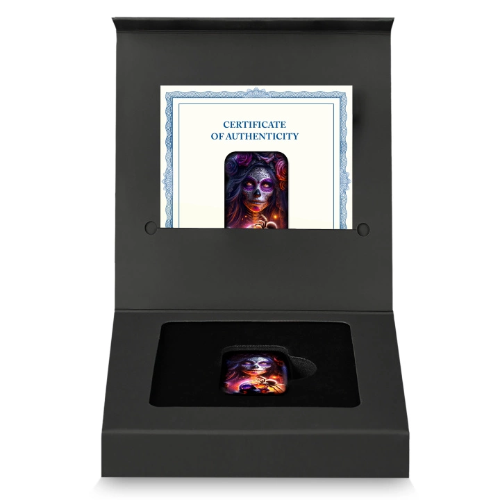 Az Asturmint ezüsttömb: Dia de los Muertos színes 2 uncia ezüst 2024 antik kivitelű az első érme a gyártó Asturmint sorozatában. A mexikói hagyományos halottak napját, a „Dia de los Muertos”-t ünnepli, amelyet november 1-jén és 2-án tartanak, és amelynek célja a halottak megemlékezése és tisztelete.