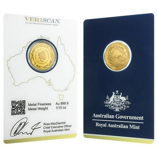 - Złota moneta bulionowa o próbie Au 9999 i wadze 1/10 uncji wyróżnia się charakterystycznym wzorem rewersu, na którym widnieje narodowy symbol Australii, kangur. Doskonały wygląd powoduje to, iż ta moneta może być idealnym prezentem bądź świetną inwestycją