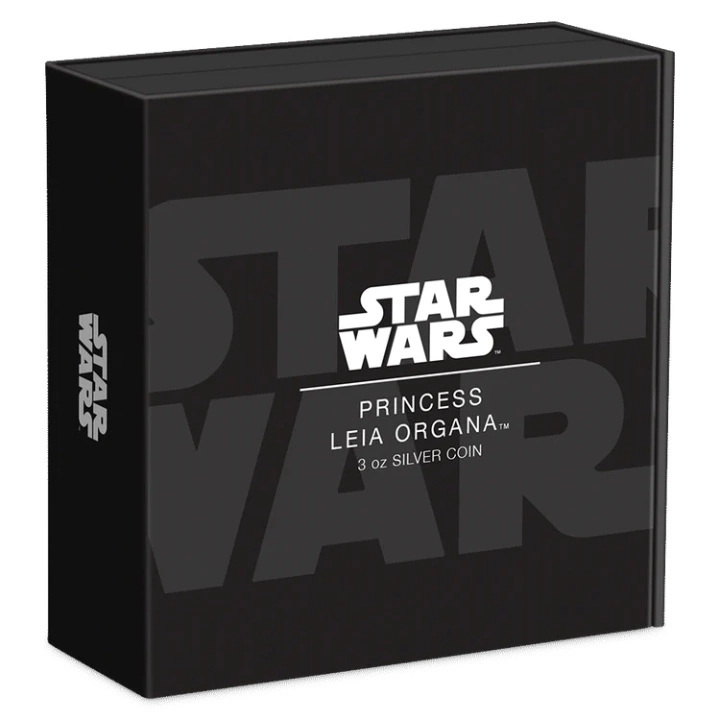 Rewers ukazuje kolorowaną Księżniczkę Leię oraz informacje na temat wagi i czystości kruszcu oraz praw autorskich należących do Lucas film Ltd.