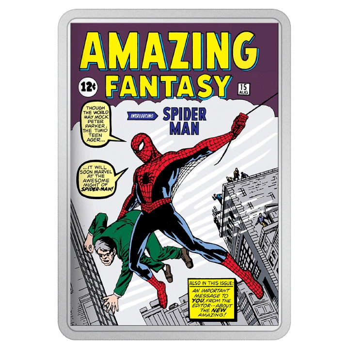 A hátoldalon a Marvel Spider-Man sorozat színes borítója látható, valamint az „AMAZING FANTASY” és „SPIDER MAN” feliratok.